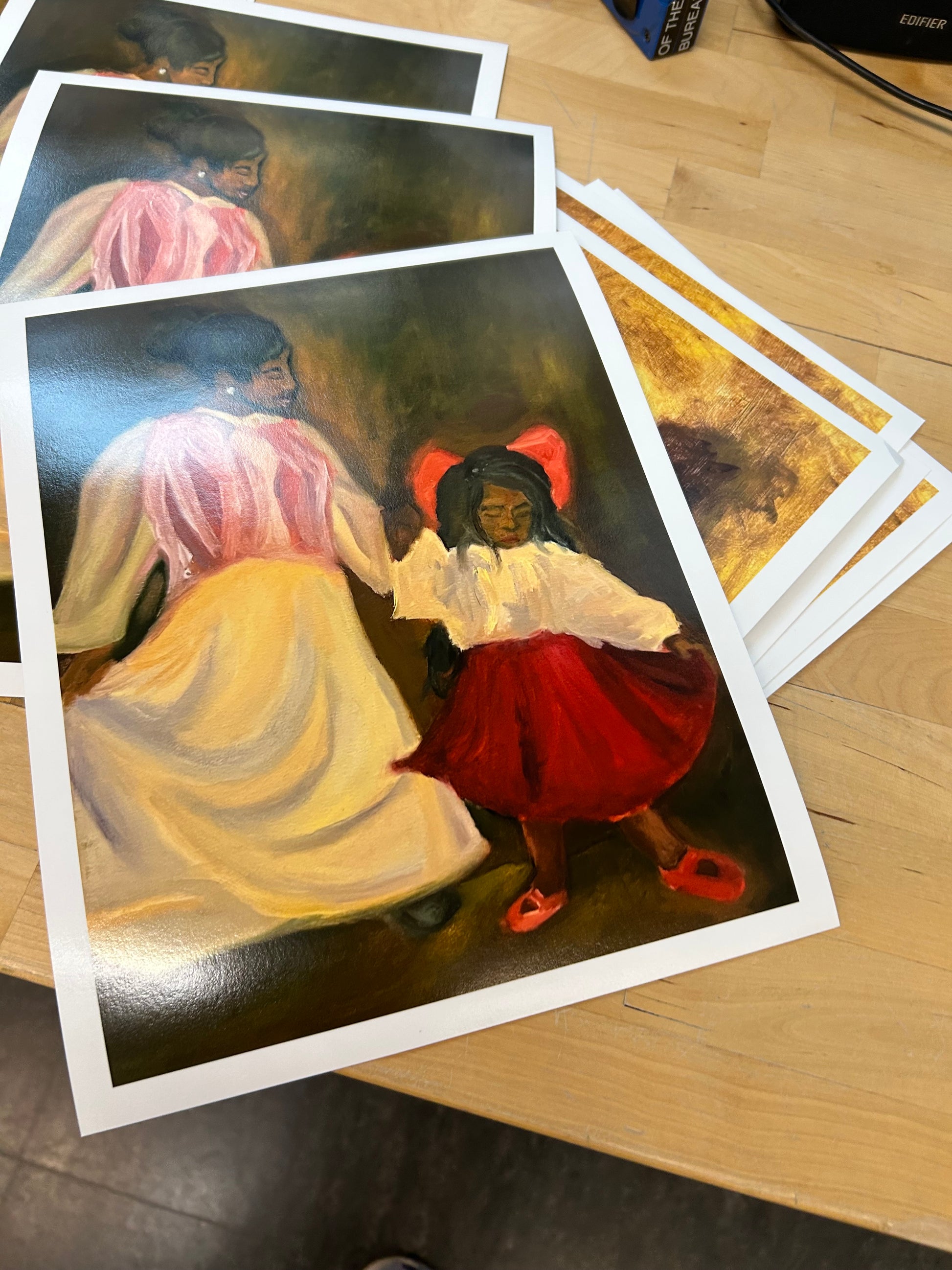 A graceful image of two daughters holding onto each other in a dark setting as their dresses glow with an intense light reflecting the beauty of youth