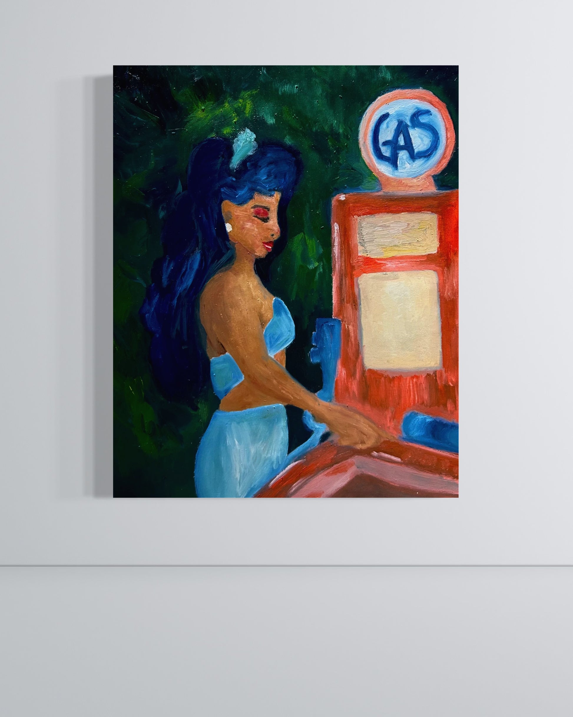 Here a woman stands in a still evergreen forest, with a quiet sense of knowing where she is and where’s she’s going. Her light glows in the darkness that surrounds her ensuring her of a calm demeanor and safety as she peacefully travels to her destination.